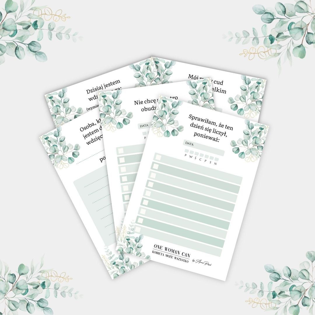 Stworzyłam dla Ciebie idealne narzędzia do codziennej pracy z wdzięcznością. Karty pracy pomogą Ci każdego dnia skupić Twoją uwagę na tym co dobre w Twoim życiu. Już po pierwszym tygodniu sumiennego wykonywania tych ćwiczeń odczujesz pierwsze rezultaty wynikające ze skupiania się na tym co dobre, ważne i wartościowe w Twoim życiu. To doprowadzi do zmiany Twojego sposobu myślenia. Z myślenia, które może dzisiaj skupia się na niedostatku, na myślenie, które jest pełne wdzięczności.
